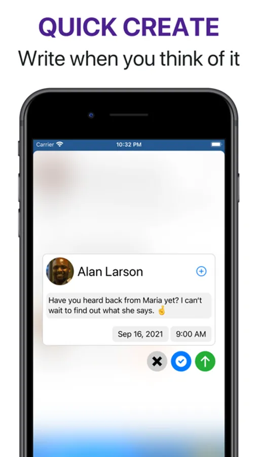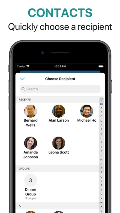 If you choose to give Carrier access to your contacts, it is effortless to select a recipient for your message. Rest assured that your contacts are not harvested or shared with anyone—it just makes your life easier. If you do not give access, you can still select a recipient.