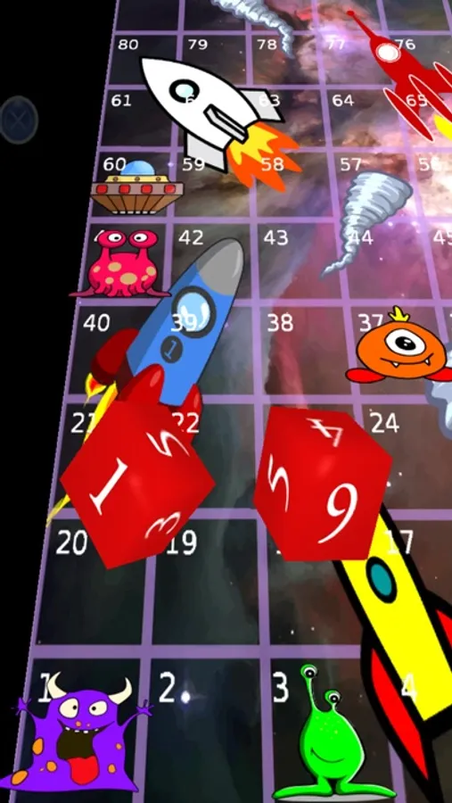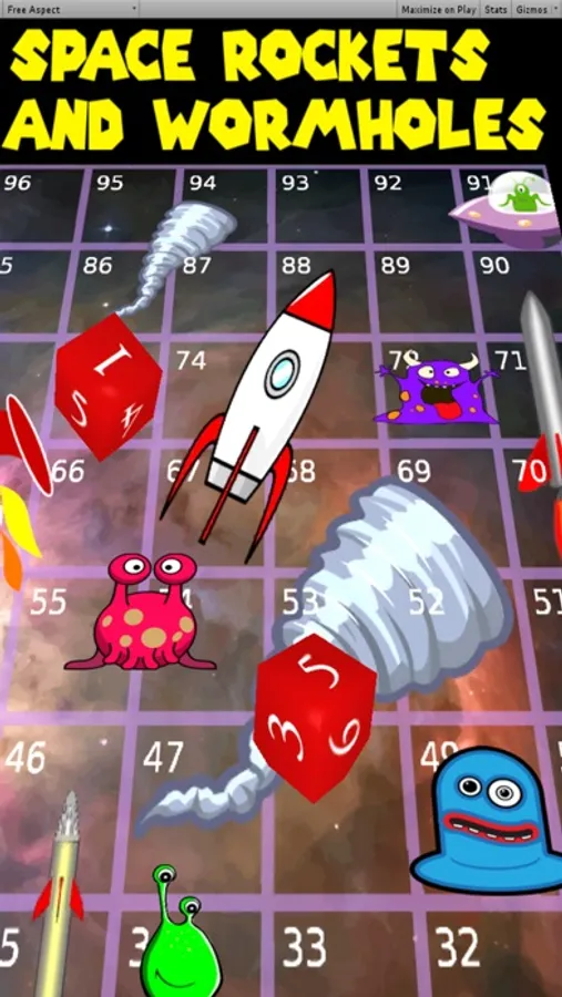 Space Rockets and Wormholes is a dice based board game for up to to 4 players, choose from lots of cute alien pieces to control. Game play is very similar to the classic game of snakes and ladders, but here you go up rockets and down wormholes. Land on a friendly planet or alien and you'll get another roll.