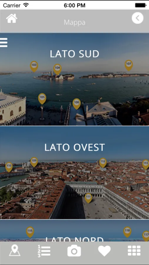 L'appli Venise Panorama est l’unique guide qui vous permettra de découvrir Venise du haut du campanile de Saint Marc. Le panorama qu’offre le campanile est unique et émotionnant, avec une vue qui embrasse toute la ville de Venise et sa lagune. Cette appli vous aidera à localiser toutes les merveilles que l’on peut admirer de là-haut ou qui se cachent entre les toits, en regardant vers le nord, l’est, l’ouest et le sud. Montez au sommet du campanile et perdez-vous, en suivant notre récit, au milieu des plus beaux endroits de la ville, dans ses palais, ses îles, ses églises ; vous volerez au-dessus des toits et de la mer, et Venise s’ouvrira à vous, inattendue.