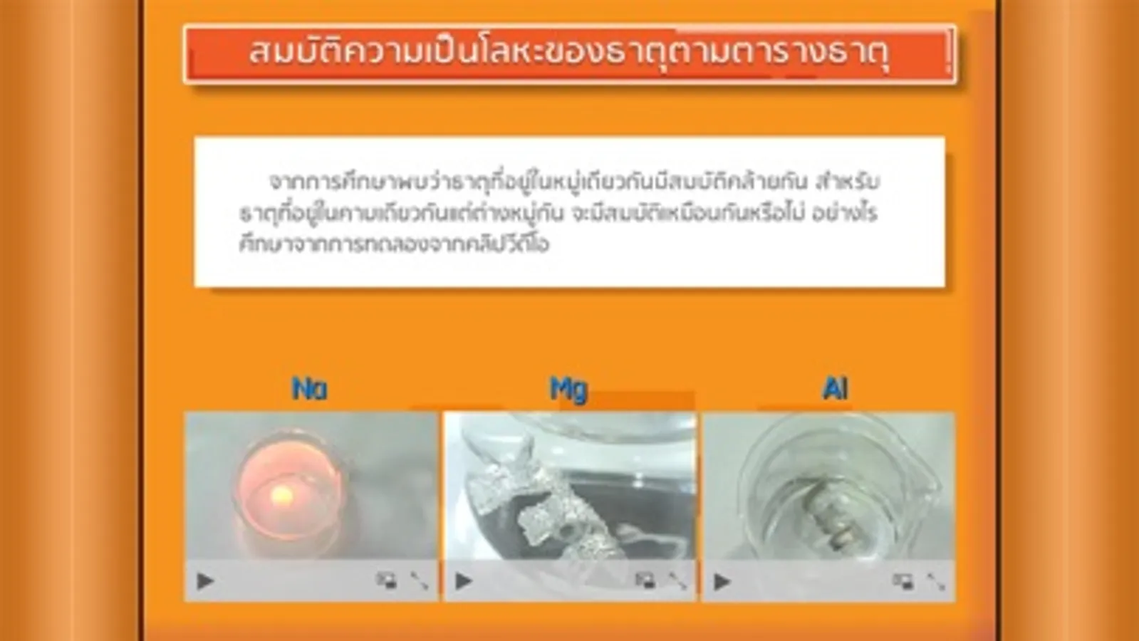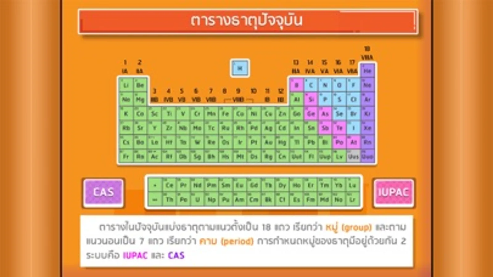 หนังสือเรียนอิเล็กทรอนิกส์ เรื่อง ตารางธาตุ (Periodic Table) เนื้อหาเกี่ยวกับการเปรียบเทียบสมบัติของธาตุโลหะ กึ่งโลหะ อโลหะ และวิเคราะห์แนวโน้มสมบัติความเป็นโลหะของธาตุตามตารางธาตุ ยกตัวอย่างการนำธาตุบางชนิดไปใช้ประโยชน์ได้อย่างเหมาะสมตามสมบัติของธาตุนั้น อธิบายสมบัติของธาตุกัมมันตรังสีและยกตัวอย่างประโยชน์และโทษของธาตุกัมมันตรังสีบางชนิด เปรียบเทียบปฏิกิริยานิวเคลียร์แบบฟิชชันกับฟิวชัน และยกตัวอย่างการใช้พลังงานนิวเคลียร์ในด้านต่างๆ รวมทั้งผลกระทบที่มีต่อสิ่งมีชีวิตและสิ่งแวดล้อม