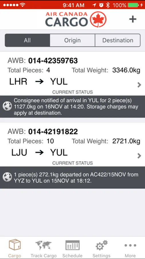 Keep track of your Air Canada flown shipments from one place. The app gives you access to real-time cargo information and lets you set notifications you are interested in for your shipments. Refresh the latest shipment details by selecting the Refresh menu option.