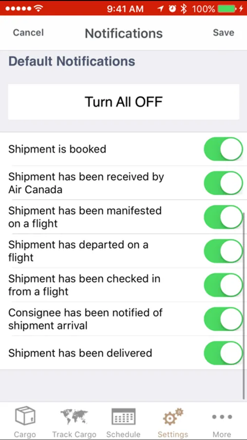 SETTINGS > CARGO NOTIFICATION SETTINGS