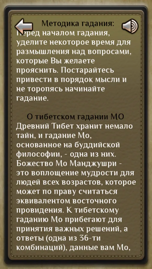 Древний Тибет хранит немало тайн, и гадание Мо, основанное на буддийской философии - одна из них. Божество Мо Манджушри - это воплощение мудрости для людей всех возрастов, которое может по праву считаться эквивалентом восточного провидения. К тибетскому гаданию Мо прибегают для принятия важных решений, а ответы (одна из 36-ти комбинаций), данные вам Мо, рассматриваются, как исходящие от Манджушри. Тибетское гадание по системе "Мо" существует на протяжении веков и дает возможность заглянуть в будущее, предугадать повороты событий и отношений. Это ясный и простой метод, чтобы прояснить наиболее важные сферы жизни и получить совет, как наиболее благоприятно решить конкретное дело.