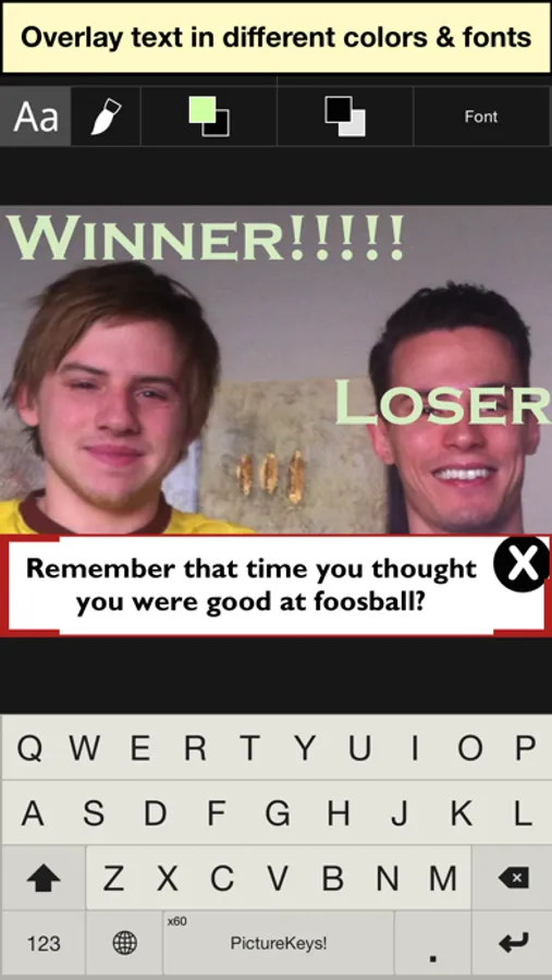 PictureKeys is a full keyboard that allows you to overlay text and paint on any image in hundreds of different colors and fonts, and send it right from within any messaging app. Use your own photos or search among millions of available images from right within PictureKeys itself. And when we say full keyboard, we mean it. Built in auto-correct, number and punctuation keyboards.
