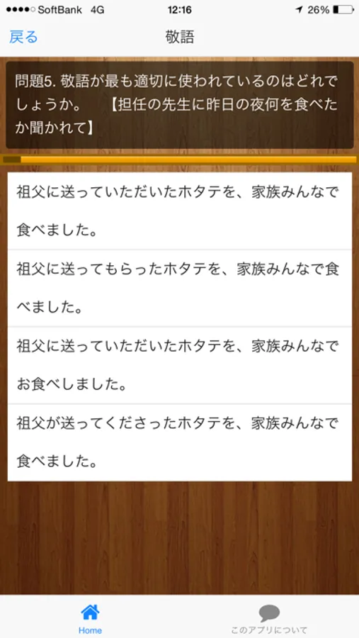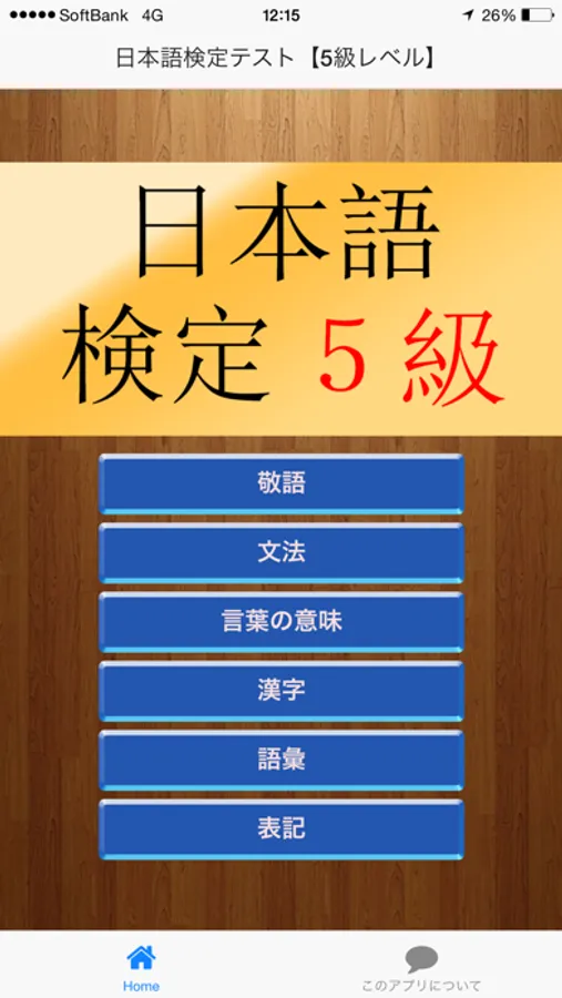 このアプリでは日本語検定の5級程度の問題をテストできます。