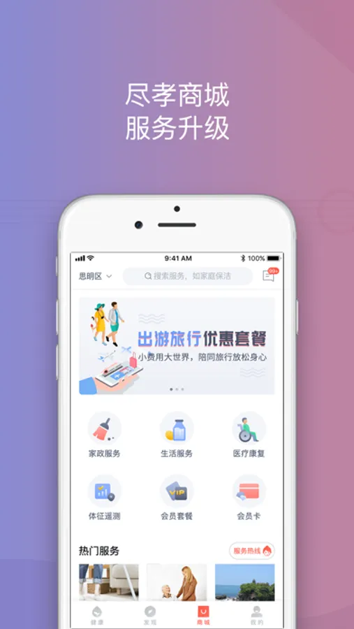 欢孝APP,向您提供便捷、优质、可靠的本地生活服务及健康购物。 找阿姨,维修、保洁等家政服务,上门保健推拿,陪医送药等健康医疗服务,购买健康套餐,监测仪器等 。