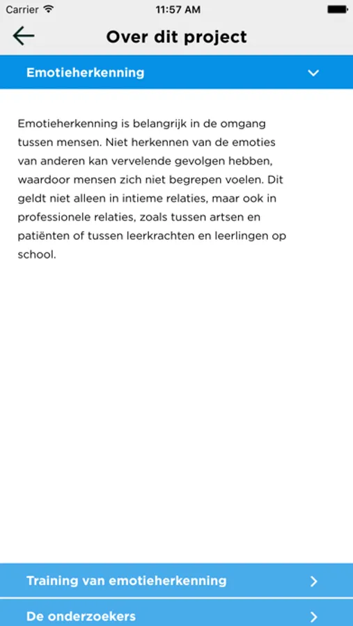 Dutch: Ontdek wat de ander voelt! Om succesvol te zijn in je sociale leven is het belangrijk om te weten hoe andere mensen zich voelen. Zijn ze boos of slechts bezorgd? Zijn de angstig of alleen teleurgesteld? De EmoReco app bevat tal van foto’s van kinderen die verschillende gezichtsuitdrukkingen tonen, van wel 15 verschillende emoties. Deze app laat je zien hoe goed jij bent in het herkennen van emoties, en je kunt deze vaardigheid verbeteren door met de app te trainen. Dus ben je een ouder, leerkracht of werk je met kinderen probeer dan deze nieuwe app.