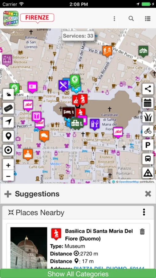 This application was developed using the services and APIs Km4City (http://www.disit.org/km4city) from DISIT Lab of the University of Florence (http://www.disit.dinfo.unifi.it ). It aims to provide updated information on the city. Km4City of companies and institutions can integrate information open, private, sensitive and / or critical in a contextualized way with those accessible to the city and create new services for their qualified personnel and / or for the citizen. And 'possible to develop App and web pages that use these services in a simple and fast. The primary tool on the web is accessible from http://servicemap.disit.org.