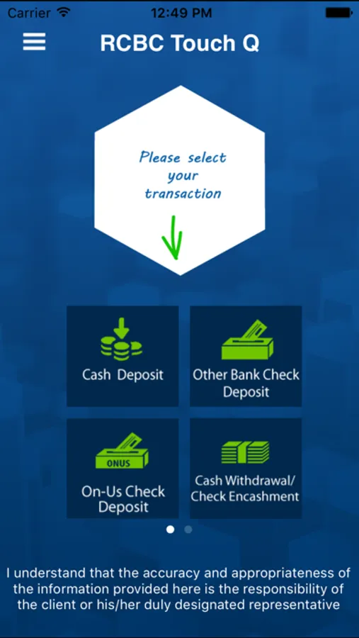 1. Select your preferred transaction/s to be done such as Cash or Check Deposit, Withdrawal, Check Encashment, Bills Payment, Fund Transfer, or Account Opening.