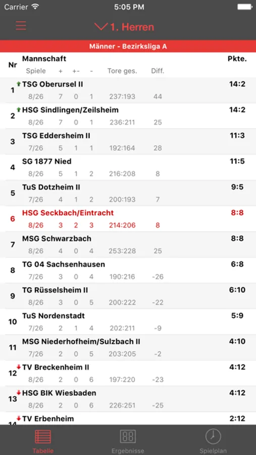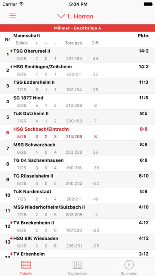 - Anzeige der Tabelle zu jeder Mannschaft