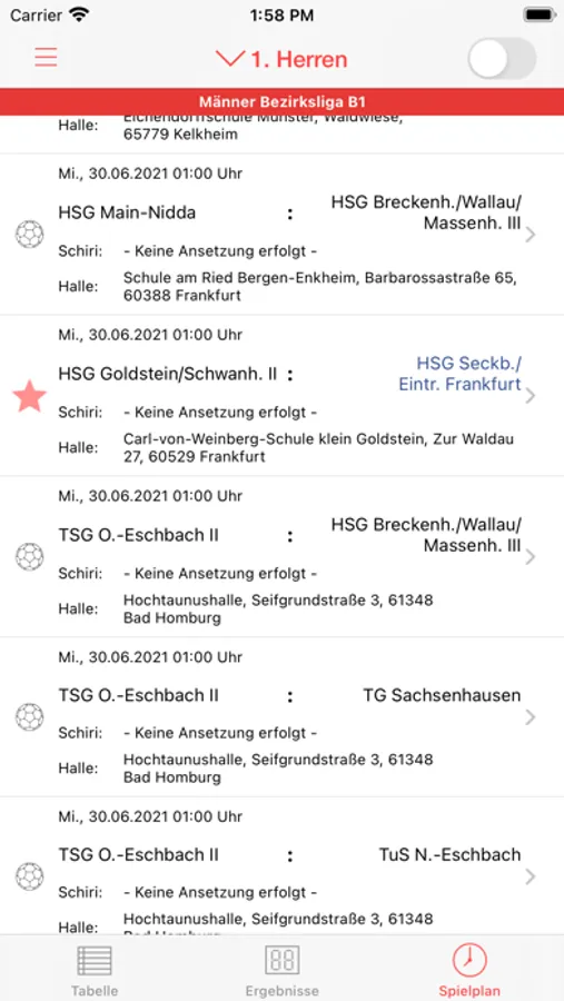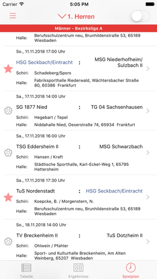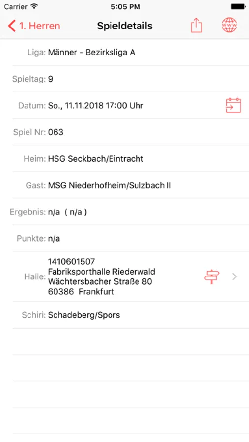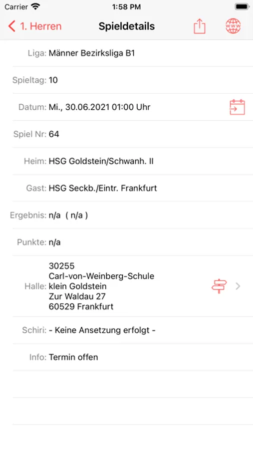 - Details zu einem Spiel (z.B. Datum, Uhrzeit, Halbzeitergebnis, Schiedsrichteransetzung, Hallenanschrift etc.)
