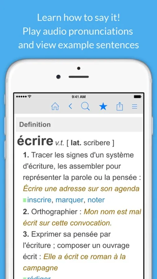 Free French dictionary and thesaurus plus French to English translations and an offline dictionary. Play audio pronunciations of words, save unlimited bookmarks, and use voice searches.
