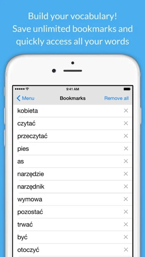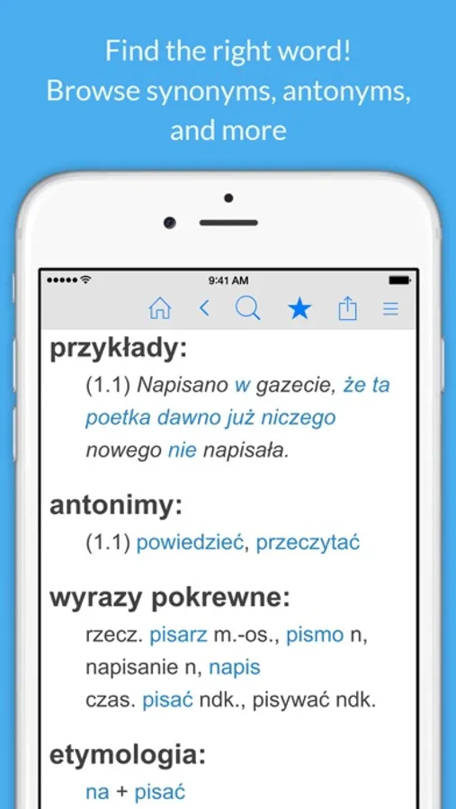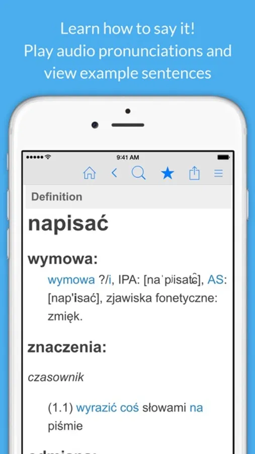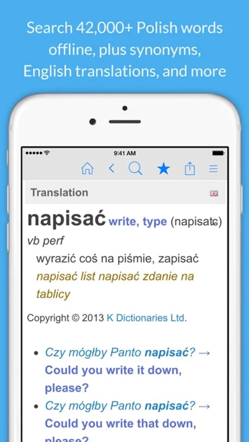 Free offline Polish dictionary and thesaurus plus Polish to English translations. Play audio pronunciations of words, save unlimited bookmarks, and use voice searches.