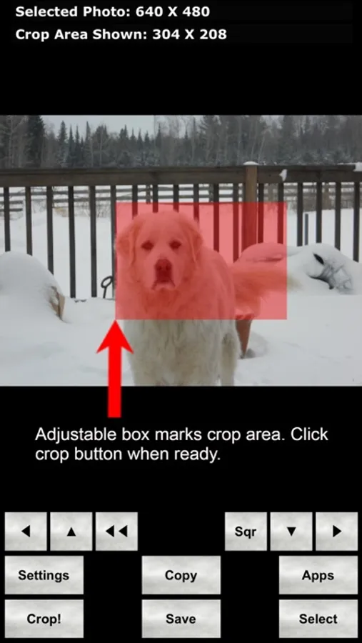 - Select any photo, then tap screen to position the crop area. Use buttons to bump edges to precise location.