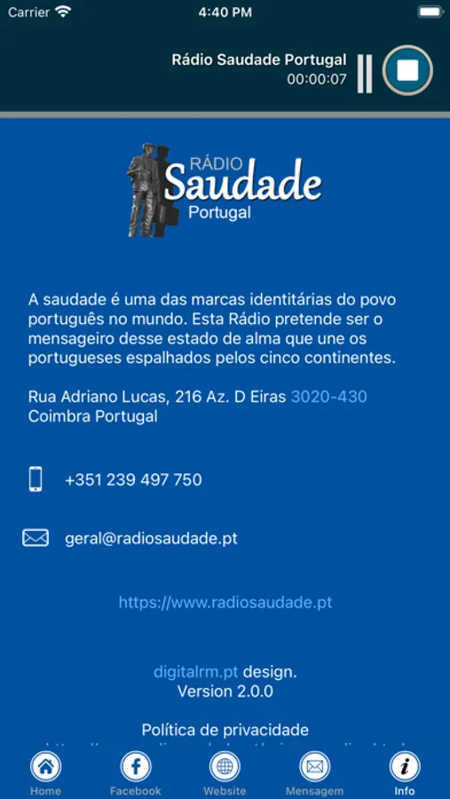 A saudade é uma das marcas identitárias do povo português no mundo. Esta Rádio pretende ser o mensageiro desse estado de alma que une os portugueses espalhados pelos cinco continentes.