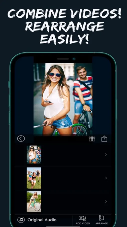 - Combine multiple videos easily. Re-arrange, remove at will.