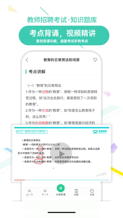 拥有行业最大的教师招聘题库之一,大数据出题,解析精确,创新知识点背诵功能,涵盖教师招聘考试全部考点,让你扔掉图书,走到哪背到哪,用了再也回不去。