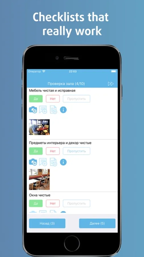 - The checklists that work. Employees pass check lists in the mobile application, confirm the fact of execution by photos, write comments, start tasks for correction. All data is stored in the cloud.