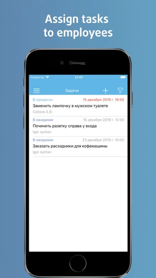 - Tasks. To ensure that no problem eludes the solution, set up repair tasks from the mobile app and assign it to the employee. The employee will know about the task by PUSH notification.