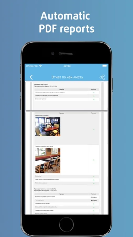 - Remote control. Upon completion of the checklist, you or your employees receive an automatic PDF report containing all the necessary information. The results are available on the website and in the app.