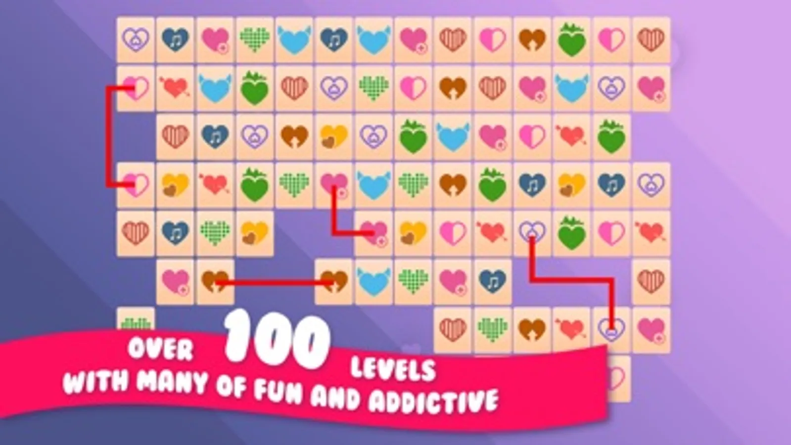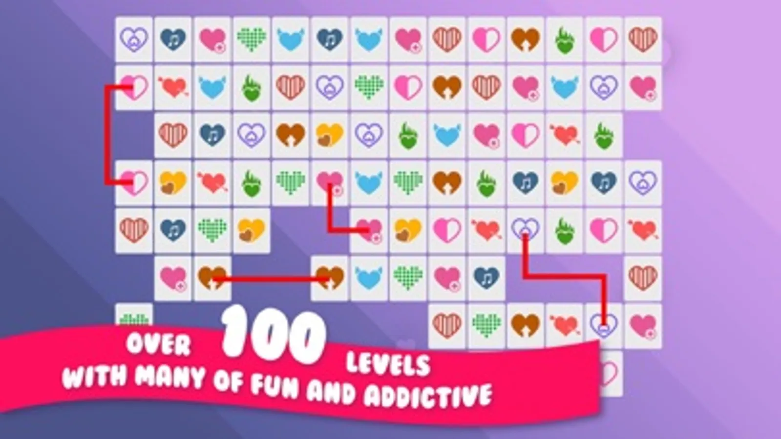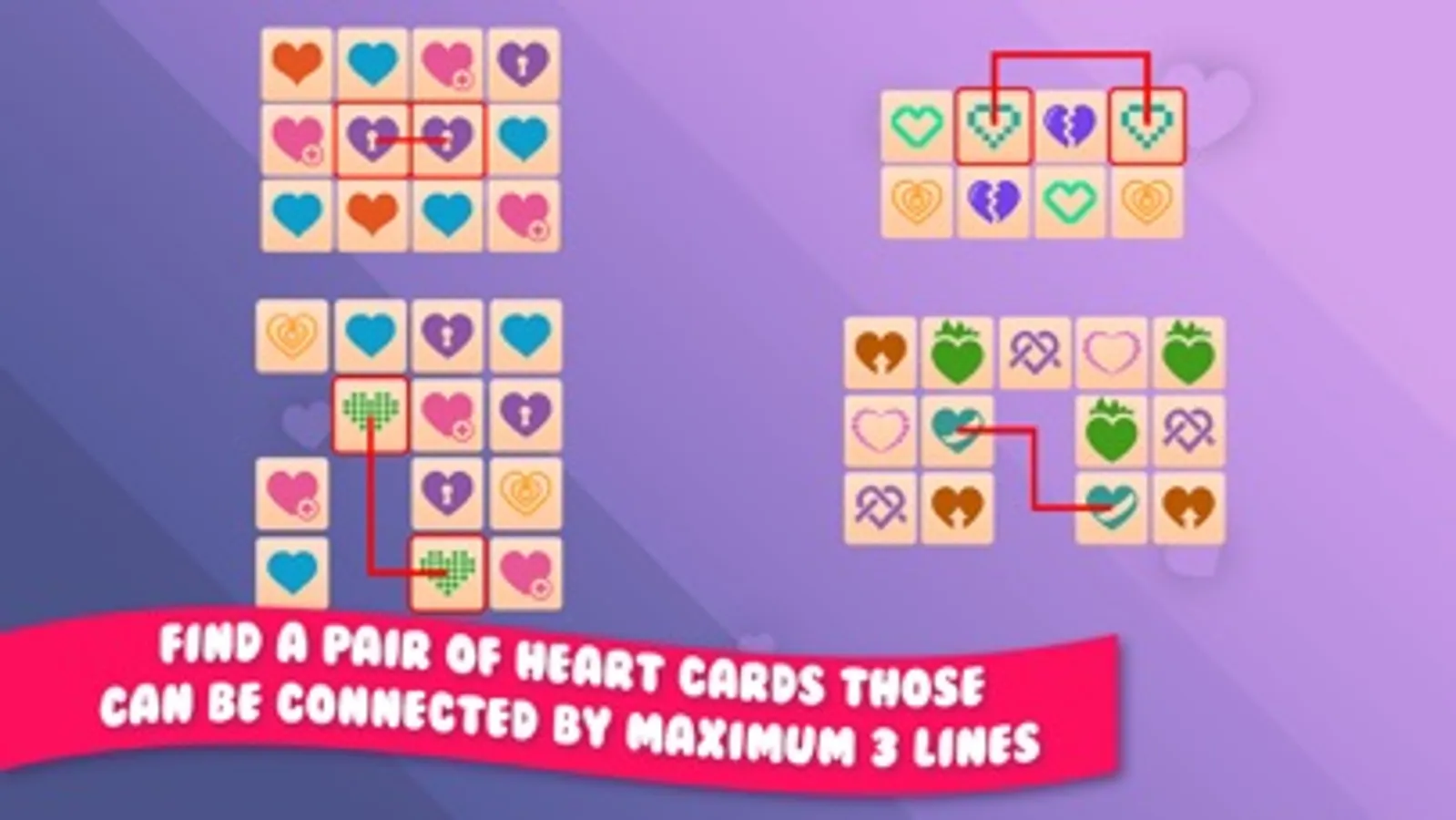 Remove all heart tiles by CONNECT 2 IDENTICAL LOVE CARDS WITHIN 3 LINES TO CLEAR THEM.