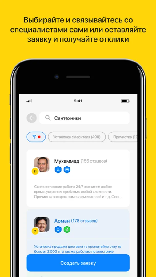 Вам не нужно искать мастеров на досках объявлений, в интернете или через знакомых. Выбирайте и связывайтесь со спецами в каталоге или создавайте заявку и получайте отклики только от заинтересованных мастеров. Наше бесплатное приложение поможет без усилий найти мастера по вашим требованиям и всего за несколько минут.