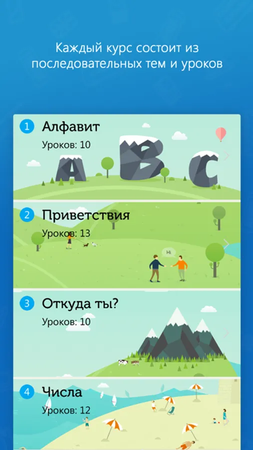 Курс — это последовательность тем и уроков. Каждый урок включает в себя видеообъяснение темы, за которым следует набор простых тренировок для закрепления усвоенного материала.