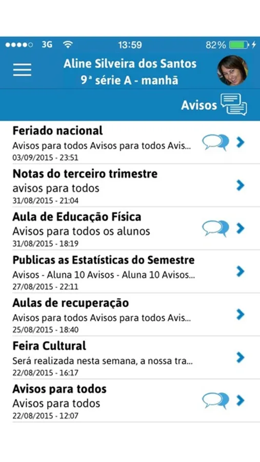 O módulo "Fale conosco" permite a troca de mensagens de texto entre a escola e os pais.