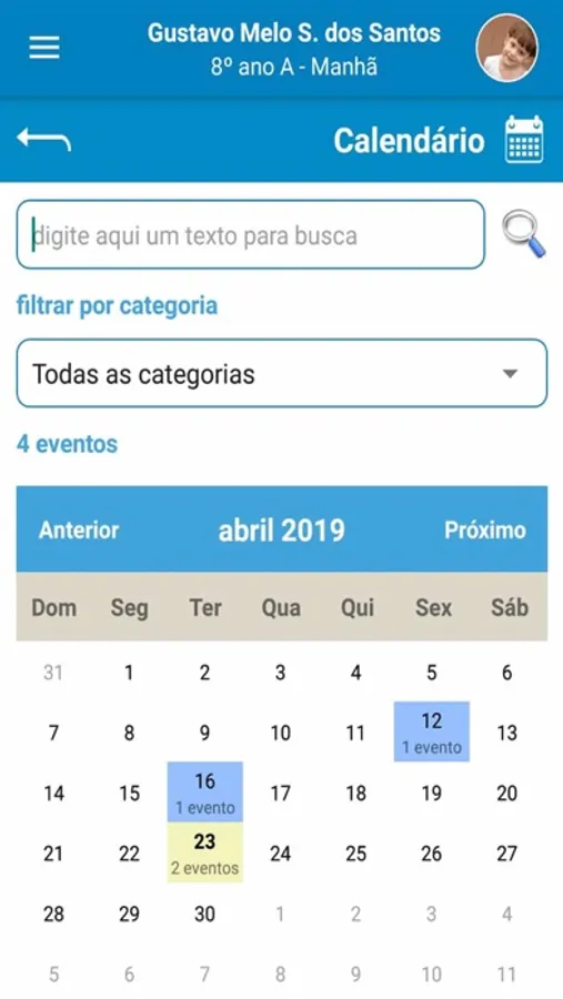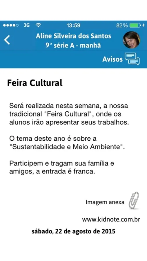 Além das mensagens com notificação, o Kid Note tem uma agenda de eventos, e possui os módulos Acadêmico, Cuidados, Chama aluno, Fale conosco, Mural de imagens e Rotina do aluno.