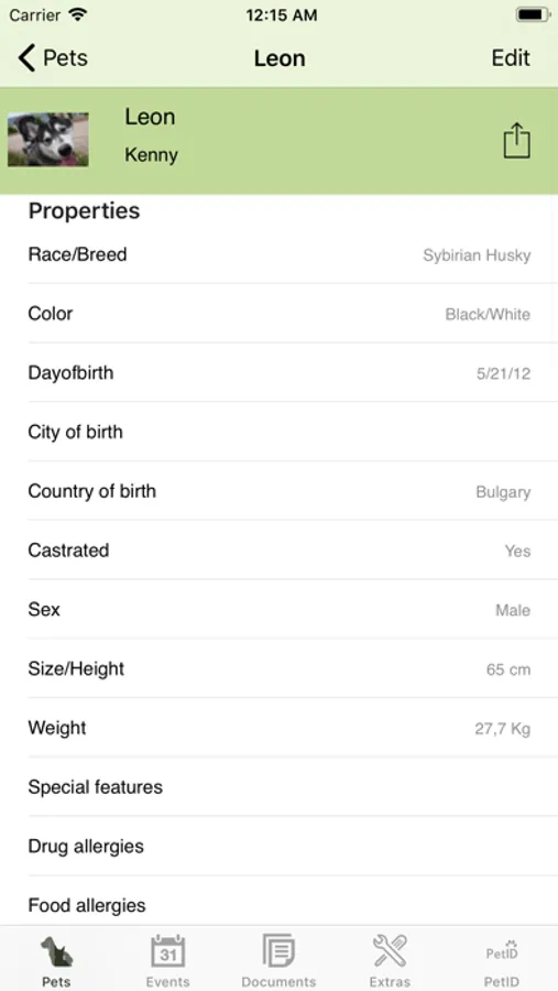 Date of birth, size, weight, sex or else characteristics - also special features- such as: Tasso- Registration or other, chip number, EU-passport number, Insurance number/legal liability number, health insurance, castrated, drug allergy, food allergy, contact data of your veterinarian and some more.