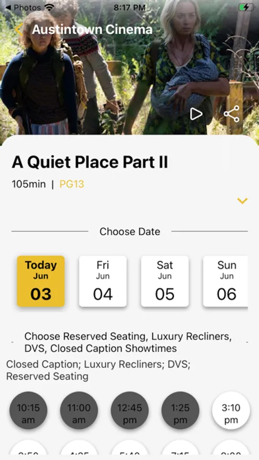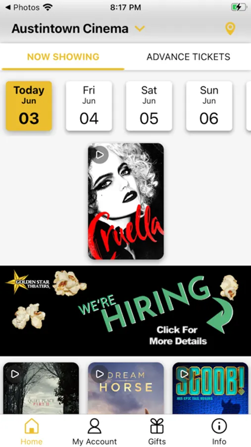Have access to movie showtimes, descriptions and buy tickets at any Golden Star Theater.