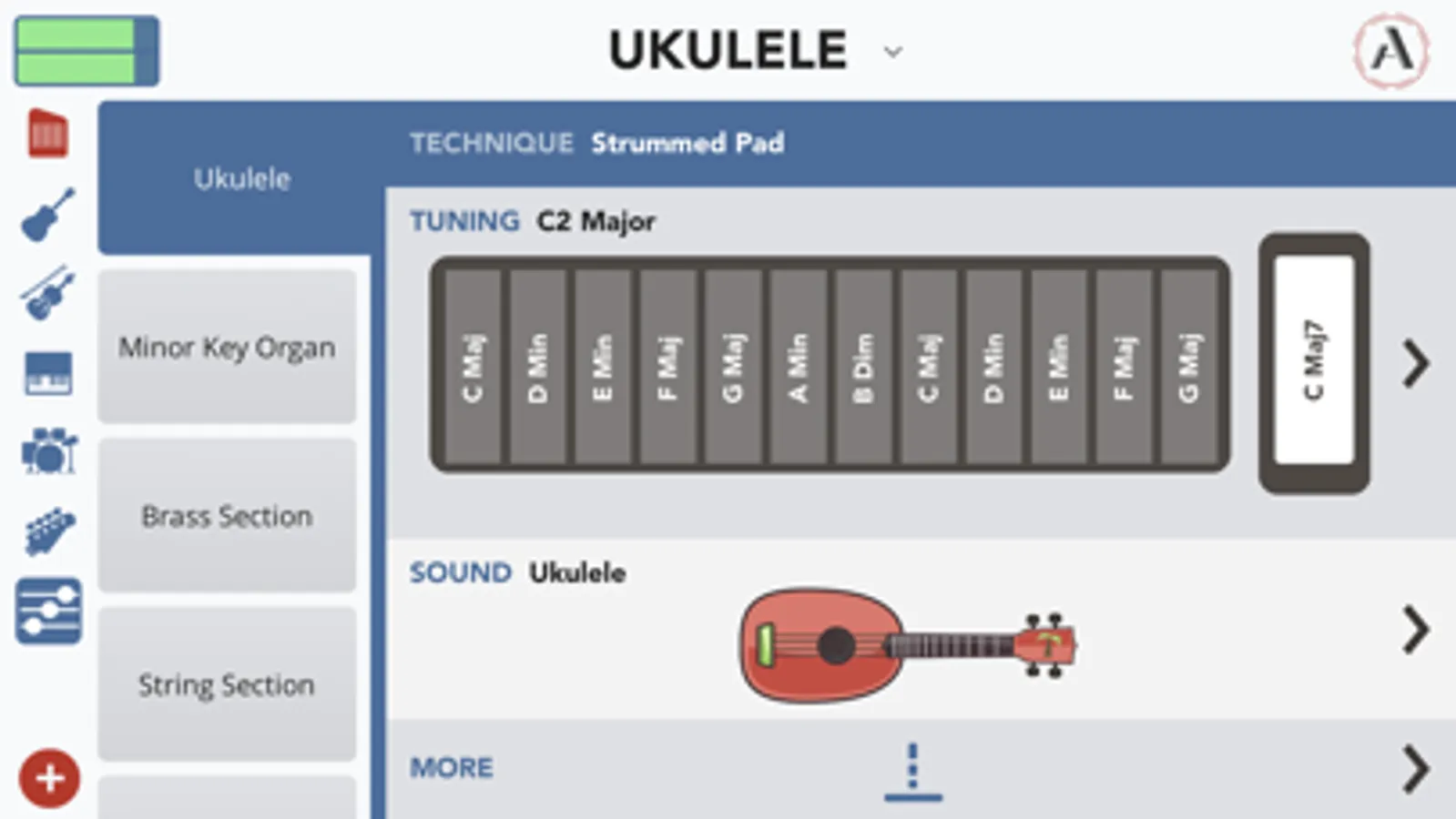 • Use the Artiphon app to play a custom-built collection of sounds that includes: guitar, violin, piano, drums, ukulele, bass, vibes, wind, bells, organ, electric piano, square wave, sine wave, and triangle wave.
