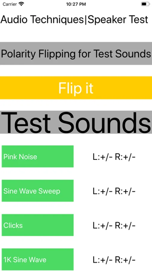 When testing the polarity flip on the mono speaker of the iOS device the sound will seem to disappear. Normal left +/- right +/- , polarity flipped left +/- right -/+ (or inverted).
