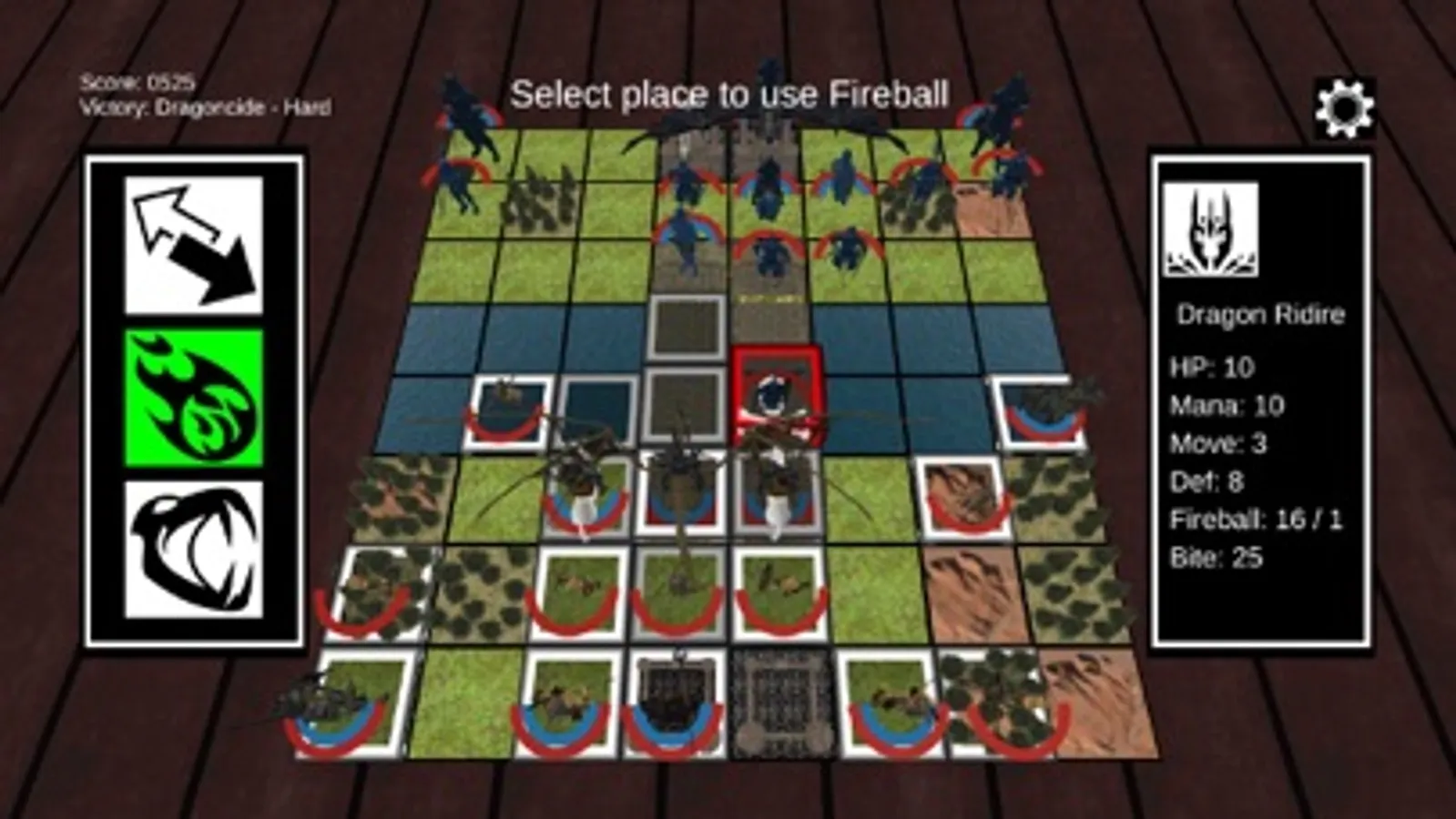 The boardgame pieces are deployed on the board in the style of Chess. Each player has 8 pawns (4 archers, 4 foot soldiers), 2 Rooks (heavy infantry), 2 Knights (Ni), 2 Bishops (mages), 1 Queen (a healer who acts more like the traditional King in Chess), and 1 Dragon Ridire (who acts more like the Queen in Chess).
