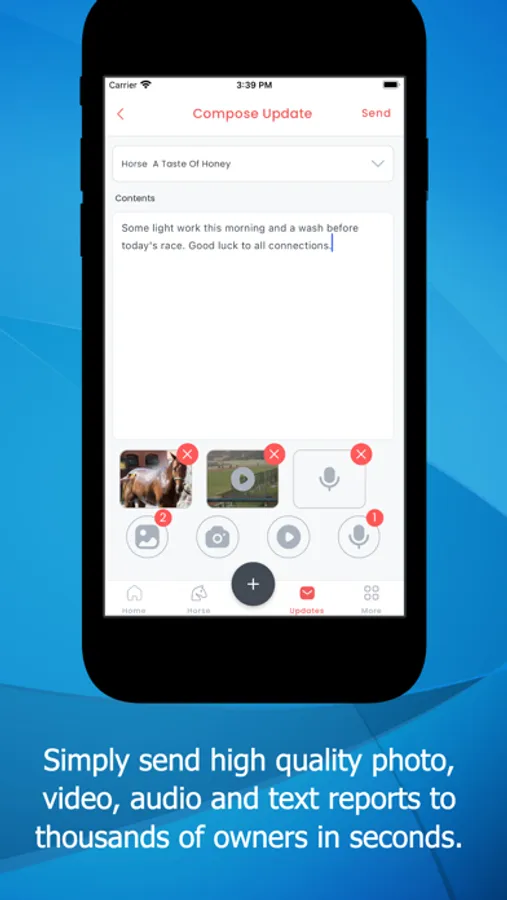 Make your owners feel like they are with you at the track, sales or in the paddock. Direct from the app send video, send audio, send photos or send text reports in seconds. Send them all securely in seconds.