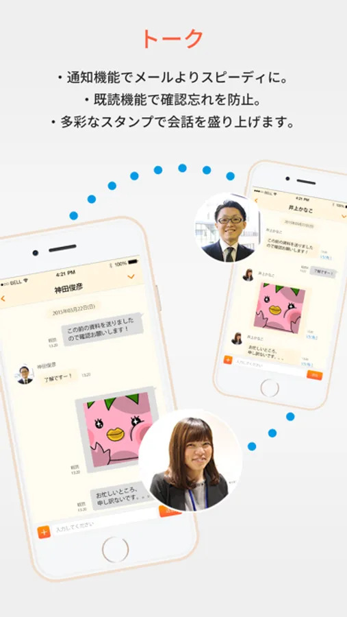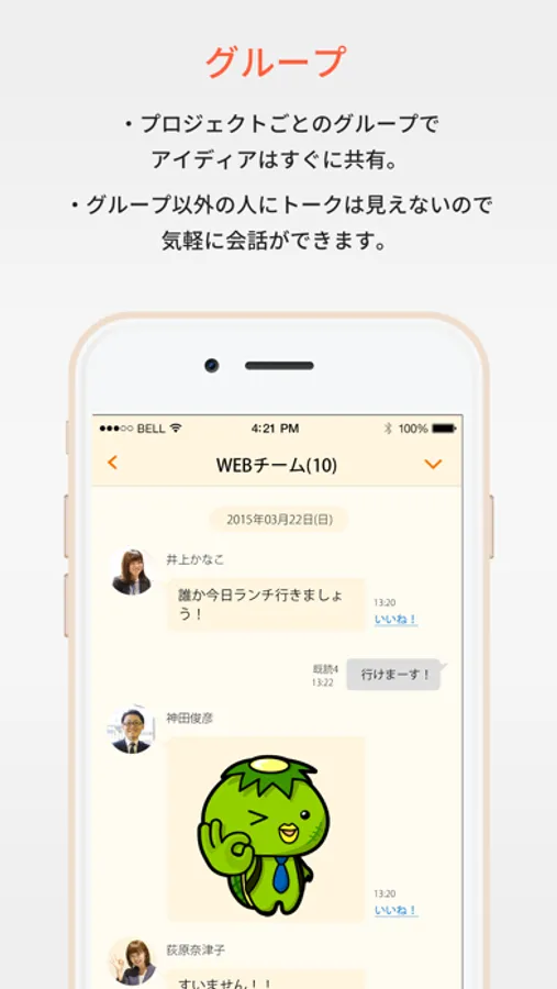 1対1のチャット、グループでのチャットをシンプルに利用できます。