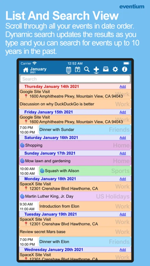 ••• See and search all your events in a vertically scrolling list