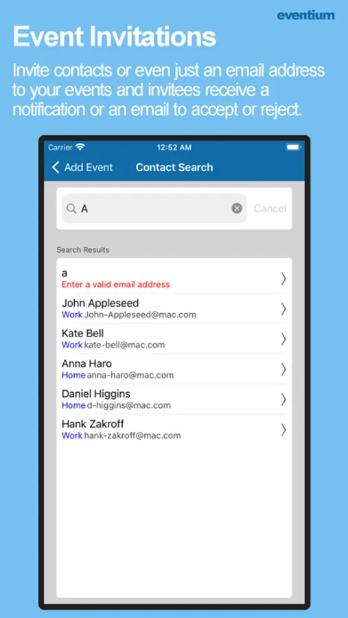 ● Invite contacts or even just an email address to events