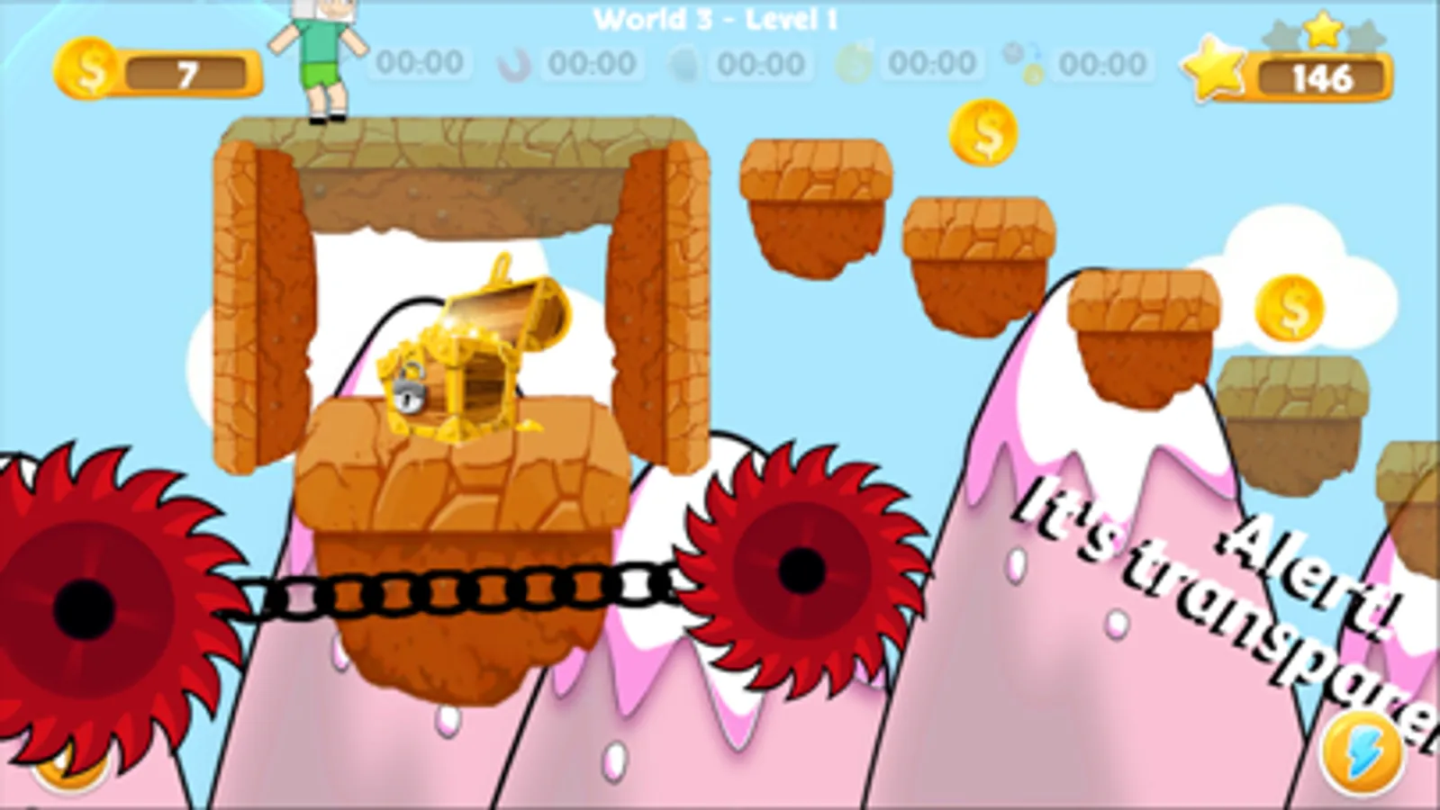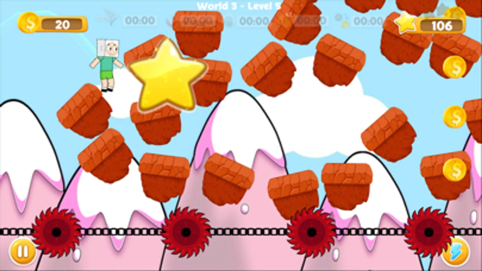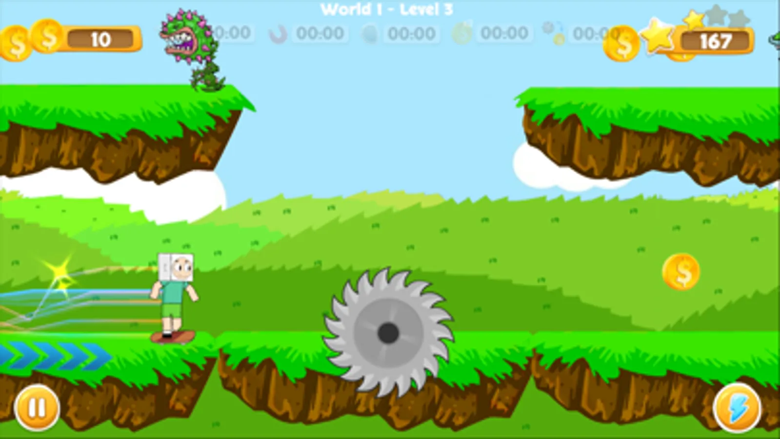 The Runner Games is an action packed adventure game with tons of challenging obstacles through magical worlds. Grab as much coins as you can to buy super powers. While on your adventure please avoid the floating wizards and man-eating plants, landmines and what ever you do please do not fall in the abyss of no return. Good new, if you did get hit by a landmine, snagged by the wizard, eaten by the man-eating plant, or fall into the abyss of no return and game over, guess what, you get to pick up where you left off when you start over. The coins you get during the game can be used to buy Super Powers to help you through the game. Are you ready to play? Its Adventure Time, download The Runner Games today!