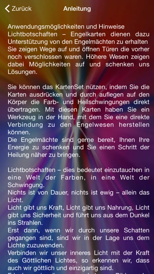 Sie können das KartenSet nützen, indem Sie die Karten ausdrücken und durch auflegen auf den Körper die Farb- und Heilschwingungen direkt übertragen. Mit diesen Karten haben Sie ein Werkzeug in der Hand, mit dem Sie eine direkte Verbindung zu den Engelwesen herstellen können.