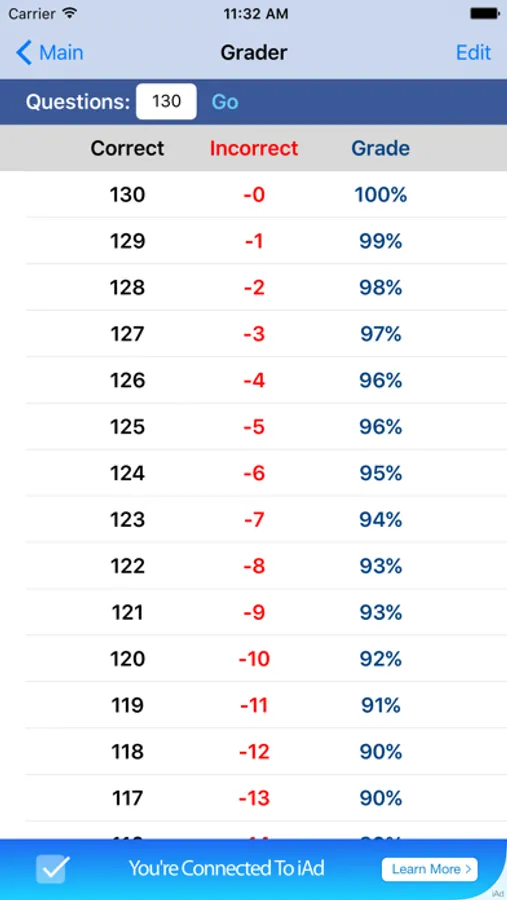 Once that you enter the total questions to grade, this calculator generates a table with the percentage grades according with correct and incorrect responses.