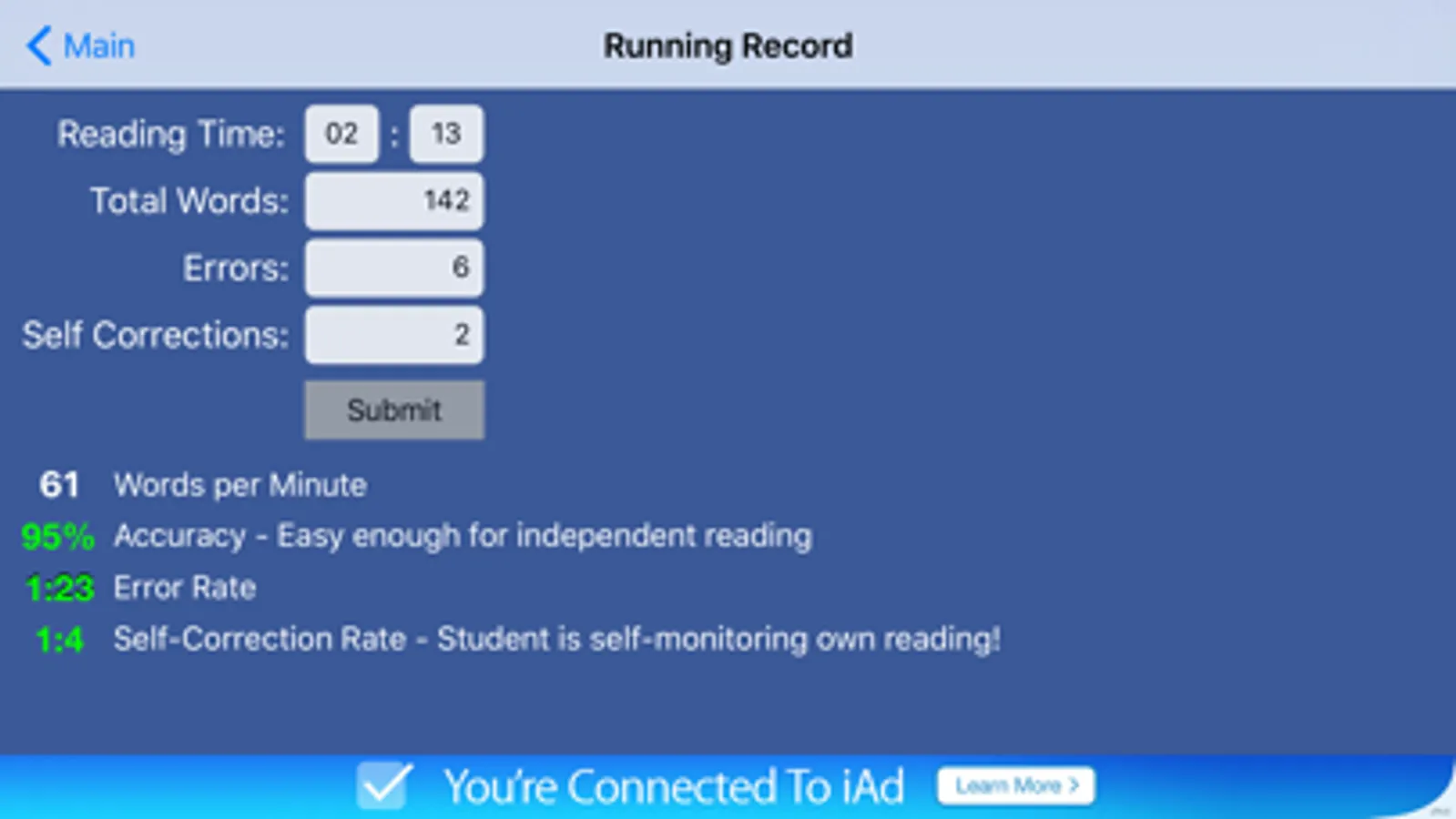 The running record calculator allows you to calculate the fluency in words per minute (WPM), accuracy percentage, error and self corrected rates. Teacher Tools includes graphic indicators to help you determine if student performance is on independent, instructional or frustration stage.