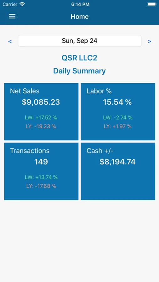 Login and immediately get a quick recap of Net Sales, Labor Percentage, Transaction Numbers, and Cash+/- compared to last week and last year.