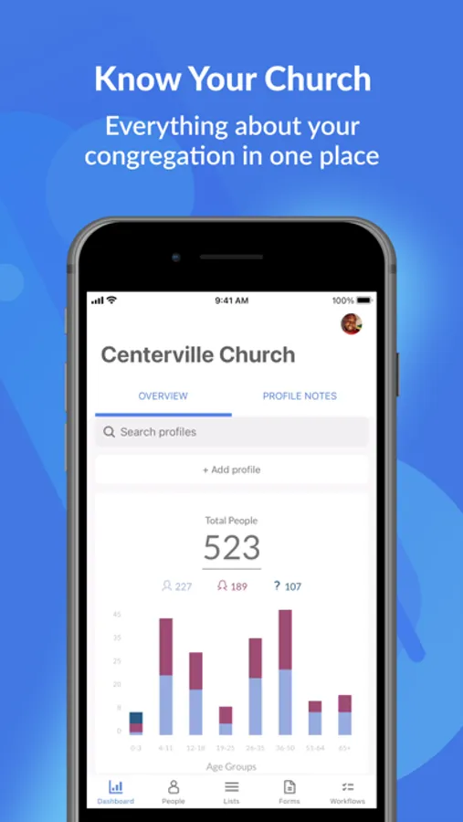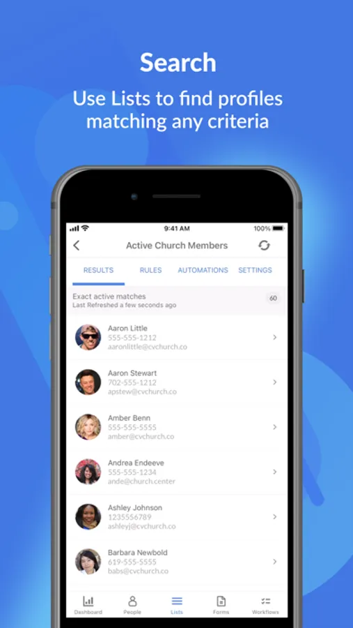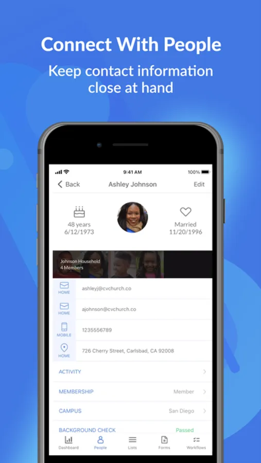 • View, create, and edit membership info and photos about the people in your church.