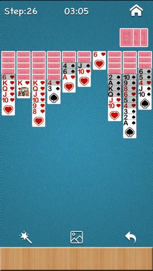 It's one of the most popular solitaire game. The purpose of the game is to remove all cards from the table, assembling them in the tableau before removing them. Initially, 54 cards are dealt to the tableau in ten piles, face down except for the top cards. The tableau piles build down by rank, and in-suit sequences can be moved together. The 50 remaining cards can be dealt to the tableau ten at a time.