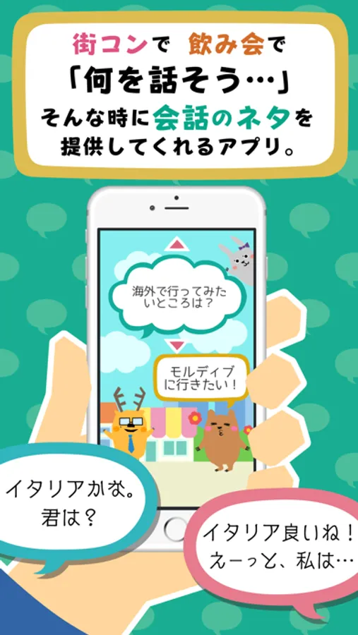 ・このアプリはあくまで「会話ネタ」を提供するだけです。その先の会話は「トークレッスン」を参考にして、がんばって盛り上げましょう。