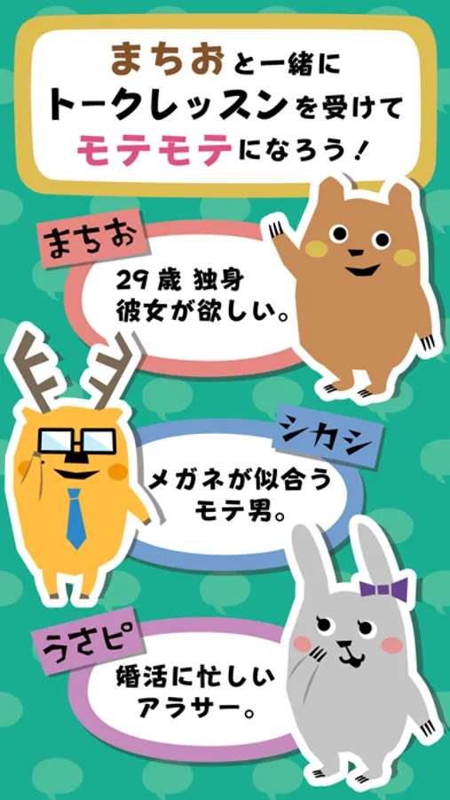 画面上のキャラクター「うさピ」をタップすると、「うさピのトークレッスン」が見られます。モテるための「会話のコツ」を色々教えてくれますよ。