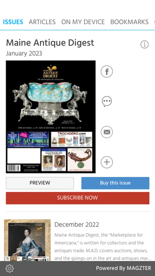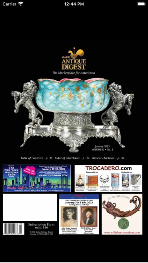 Maine Antique Digest, the "Marketplace for Americana," is written for collectors and the antiques trade. M.A.D. covers auctions, shows, and the goings-on in the art and antiques marketplace. It's provides readers with in-depth coverage of the antiques and art markets.