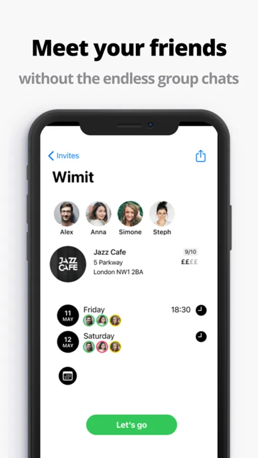 Wimit is the easiest way to find a place, date and time to meet your friends. Download the app and say goodbye to endless chat messages about when and where to go.