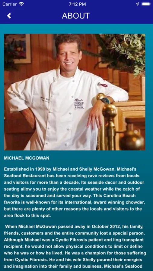 We all knew Michael as a renowned Chef and for his international award winning seafood chowder, but what made him a person so loved and respected was the way he choose to live his life: as an awesome husband, father and son; to be active in his community as a volunteer, by sponsoring athletic teams; holding spirit nights to donate a percentage of a day’s income to local schools; organizing the annual Shrimp Open Golf Tournament to benefit the Cystic Fibrosis Foundation and Duke Lung Transplant Program; and to always greet his customers with enthusiasm and genuine desire to provide them with the best service to make their dining experience a pleasure. Through it all, medically, professionally and personally, Michael always gave back, not only for medical research but in every way, every day. There was nothing limited in the life of Michael McGowan except too short a time with us.